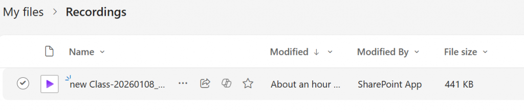 You can access ALL recordings (including class recordings) by locating the “Recordings” folder inside the “My files” directory.