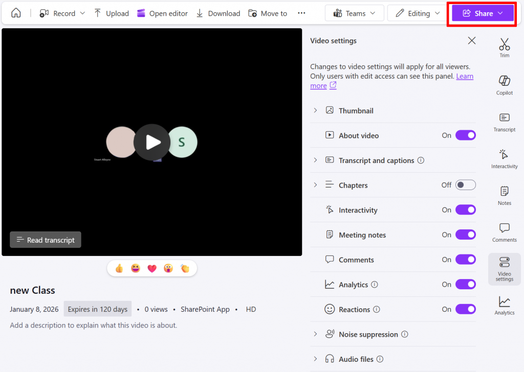 Click on the sharing icon (the box with the arrow) to be taken directly to the video in your OneDrive.