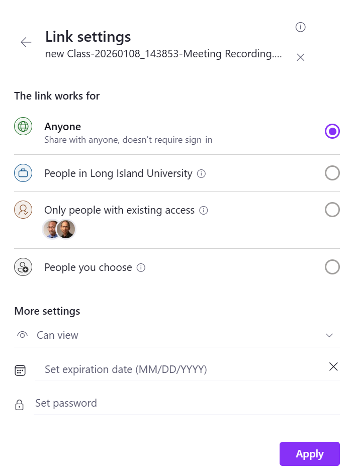 Once the link get’s coped, you can click on the “Settings” to manage the options for your shared link. Unless the video is for a specific person, it is recommended to either use either “Anyone” or “People in Long Island University.” Then click “Apply.”