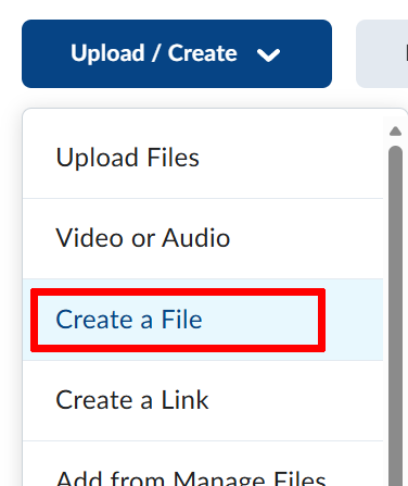In Brightspace, select the appropriate module in a course for your recordings or make a new one. Then select “Upload/Create” and choose “Create a File.”